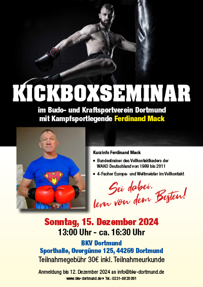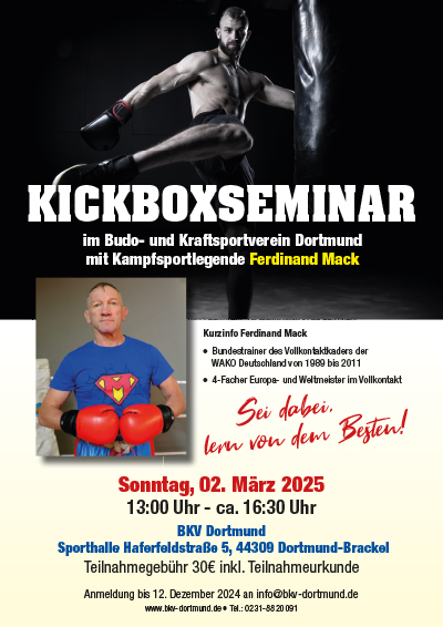 KICKBOXSEMINARim Budo- und Kraftsportverein Dortmundmit Kampfsportlegende Ferdinand Mack Sonntag, 02. März 202513:00 Uhr – ca. 16:30 Uhr BKV DortmundSporthalle Haferfeldstraße 544309 Dortmund-Brackel Teilnahmegebühr 30 €, inkl. TeilnahmeurkundeAnmeldung bis 12. Dezember 2024 an info@bkv-dortmund.de Ausscheibung herunterladen
