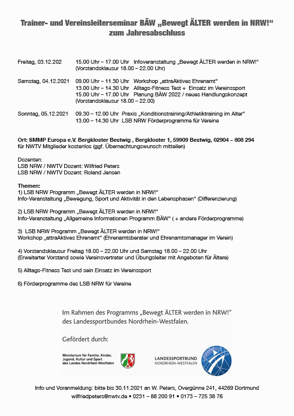 Freitag, 03.12. bis Sonntag, 05.12.2021 Ort: SMMP Europa e.V. Bergkloster Bestwig , Bergkloster 1, 59909 Bestwig, 02904 – 808 294 für NWTV Mitglieder kostenlos (ggf. Übernachtungswunsch mitteilen) Dozenten: LSB NRW / NWTV Dozent: Wilfried Peters LSB NRW / NWTV Dozent: Roland Jensen Themen: 1) LSB NRW Programm „Bewegt ÄLTER werden in NRW!“ Info-Veranstaltung „Bewegung, Sport […]