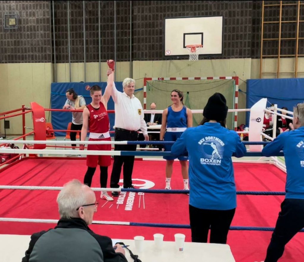 Endlich nach der langen Zeit des Pausierens greift der BKB mit Sportlern und Sportlerinnen wieder in das Amateurboxen auf Wettkämpfen ein. Nachdem David Brumar (NRW Meister) und Lennart Brendler (Vizewestfalenmeister) erfolgreich waren, konnte nun Valentina Peer ihren ersten Amateur-Boxkampf bestreiten. Bei dem Kadersichtungsturnier am 30.11.2021 in Warendorf traf sie auf die erfahrene Corinna Krusche (20 Kämpfe) vom BC Mülheim-Dümpten e.V. In einem technisch hochklassigen Kampf, bei dem Valentina ihre Gegnerin ständig unter Druck setzte, mußte sich unsere Boxerin der größeren Erfahrung der Mülheimer Konterboxerin geschlagen geben. Betreut wurde Valentina von ihrer Freundin Christina Hammer und unserem Trainer Jürgen Milhausen. Trainer Wilfried Peters war bei diesem Event des BC Warendorf als Punktrichter eingesetzt.