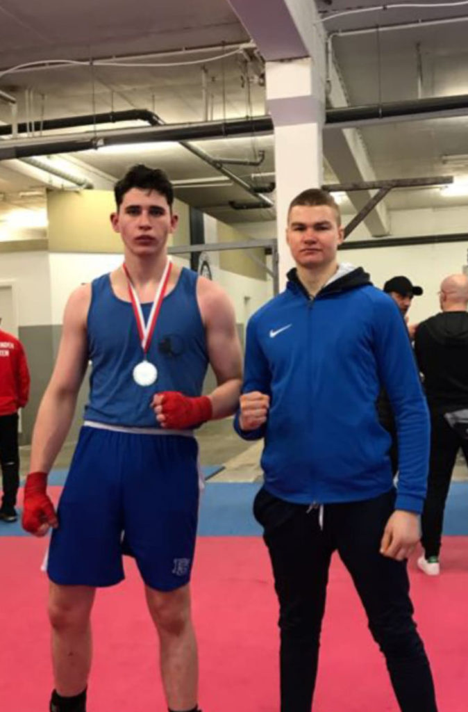 David mit seinem zweiten Coach Luca Milhausen (nicht auf dem Foto Coach Jürgen Milhausen) nach dem erfolgreichen Kampf mit Medaille.