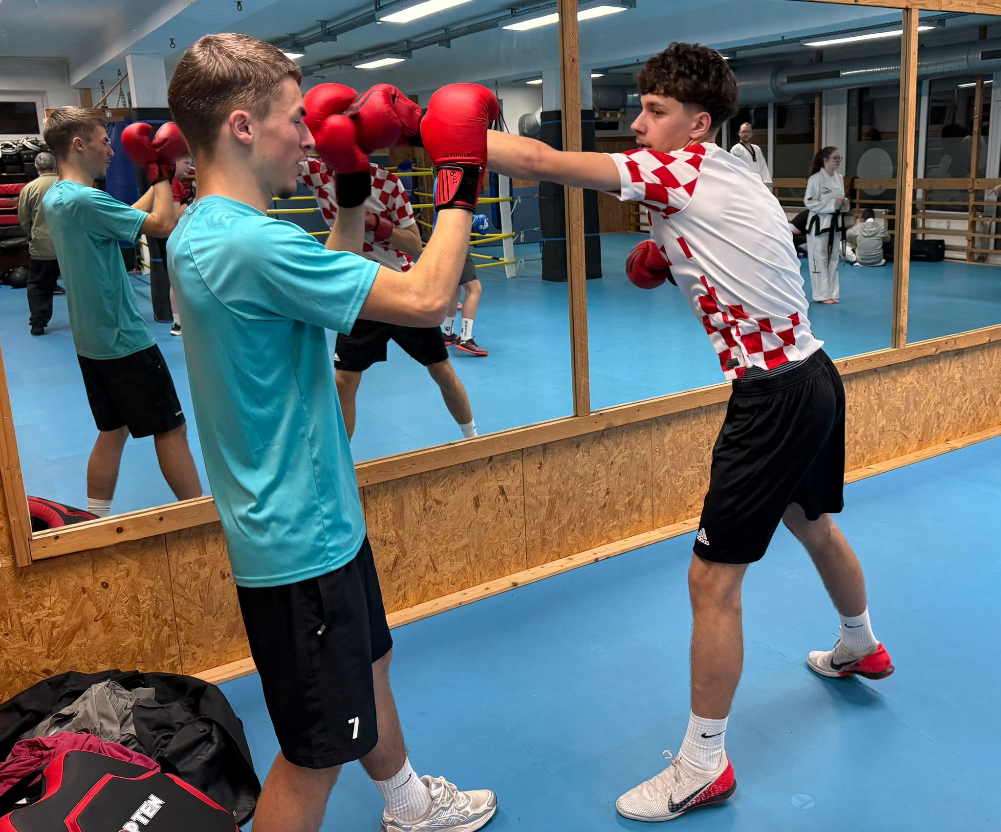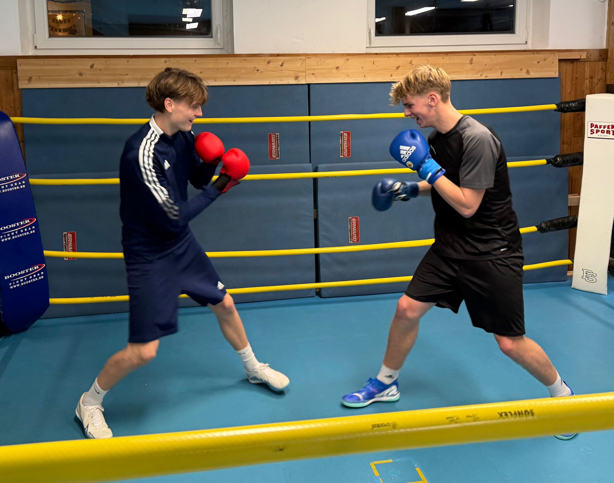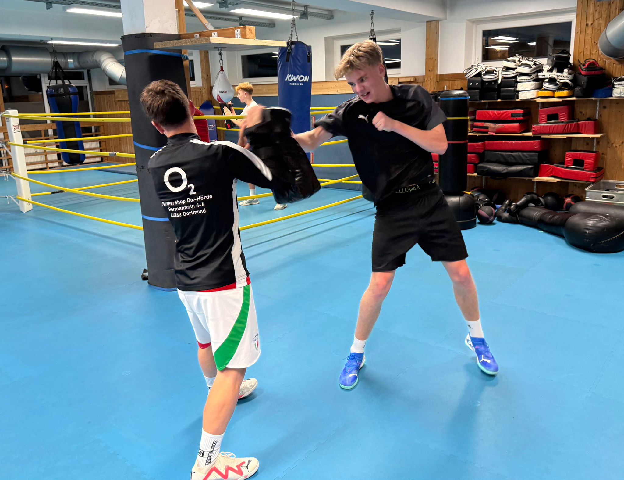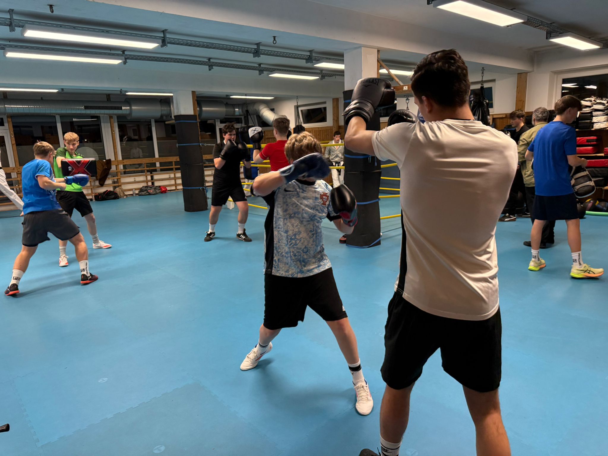 Interessant wurde es dann, als die Boxhandschuhe angezogen wurden und Schläge sowie Abwehren mit Partner geübt wurden. Für die Fussballer waren die Übungen und Techniken eine ungewohnte Erfahrung. Beim freiwilligen bedingten Sparring (Trainingskampf) und an den Sandsäcken konnten sich die Fußballer noch mal richtig auspowern.